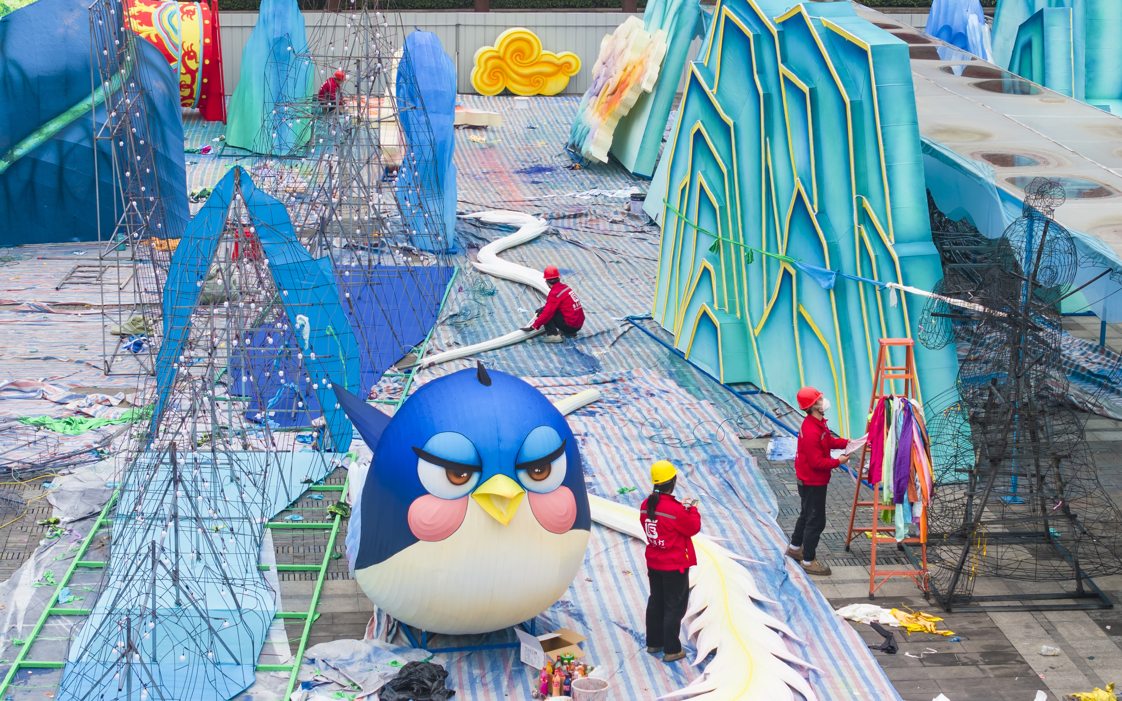 1月23日晚,自貢中華彩燈大世界火樹銀花。流光溢彩的燈海盛景,拉開了第32屆自貢國際恐龍燈會(huì)亮燈暨四川省迎春文旅促消費(fèi)活動(dòng)的序幕。在200多公里外的重慶園博園龍景湖畔,焊槍滋滋作響,火星如流星濺落。自貢彩燈匠人王東瞇著眼,用鉗子彎折著一根根鐵絲,在他身后,一尊高達(dá)15米、寬約40米的《巾幗良玉》燈組巍然屹立,一臺(tái)西部最大的水上燈會(huì)正在緊鑼密鼓籌備之中。