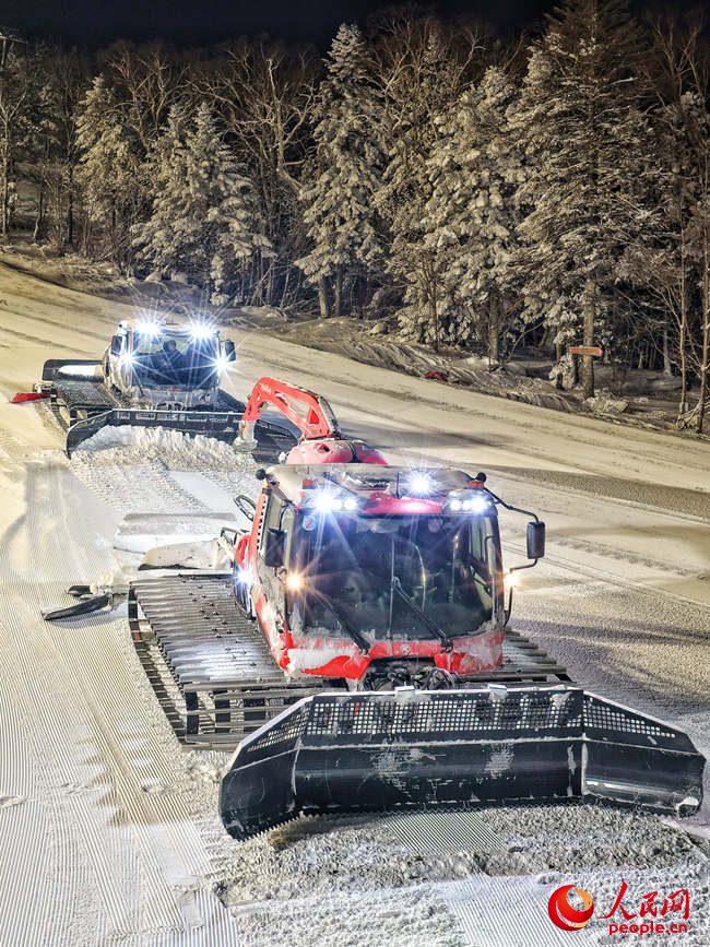 前鏟破冰殼、履帶壓碎雪塊、雪犁二次加工處理……壓雪機(jī)所到之處,原本有道道劃痕的雪道變得松軟、平整、順滑,“面條雪”逐漸顯現(xiàn)。