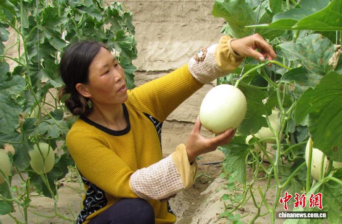 圖為原本伏地生長的臺(tái)灣“玉菇”甜瓜,落戶民勤變成了吊瓜。馬愛彬 攝