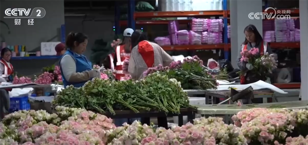 這里的智能溫室大棚可以實現(xiàn)一鍵控制棚內(nèi)的溫度、濕度,采收后的玫瑰花一般會先經(jīng)保鮮液浸泡,再送入毛花庫預冷,讓鮮花進入“休眠”狀態(tài)。隨后再經(jīng)工人師傅裁切、分級、包裝,通過全程低溫冷鏈運往各地。如今,當?shù)氐孽r切玫瑰瓶插期從1周延長至15天。由于鮮切玫瑰訂單持續(xù)增長,為保障市場供應,工作人員加急分揀包裝,將玫瑰花及時發(fā)往各地,當?shù)匾查_通了線上直播銷售,消費者線上選花、比價下單,冷鏈物流最快可在48小時內(nèi)就能送達。