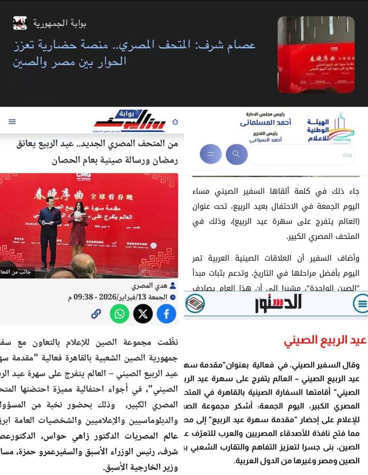 沙拉夫表示,本次活動(dòng)選擇在大埃及博物館舉辦,具有十分重要的意義,這是埃中兩大古老文明相知相交、交融共生的生動(dòng)見證。春節(jié)既承載著萬(wàn)象更新的美好希冀,也開啟了辛勤耕耘的嶄新周期,蘊(yùn)含著人與自然和諧共生、尊重時(shí)序節(jié)律的中國(guó)哲學(xué)。2026年是馬年,在中國(guó)文化中,馬寓意著力量、進(jìn)取、活力,更象征著自信奔赴未來(lái)的精神。這種精神內(nèi)涵與當(dāng)前埃中關(guān)系蓬勃發(fā)展的良好態(tài)勢(shì)高度契合。愿兩國(guó)攜手并進(jìn),邁向更加光明的未來(lái)。