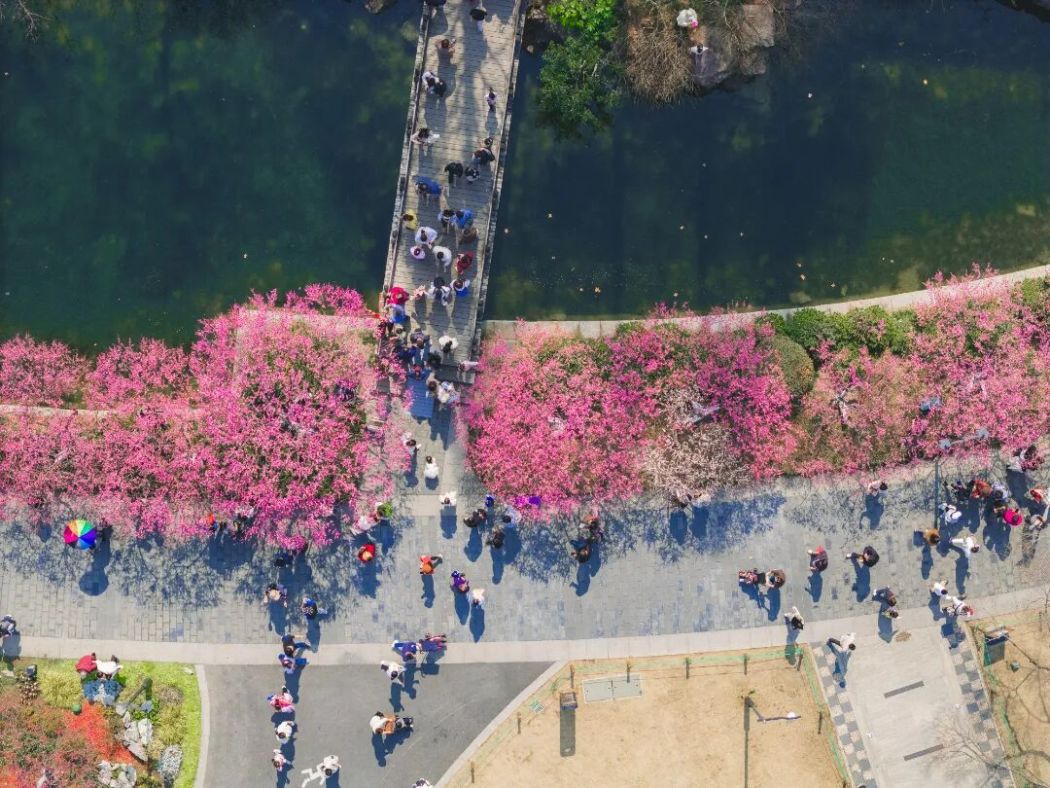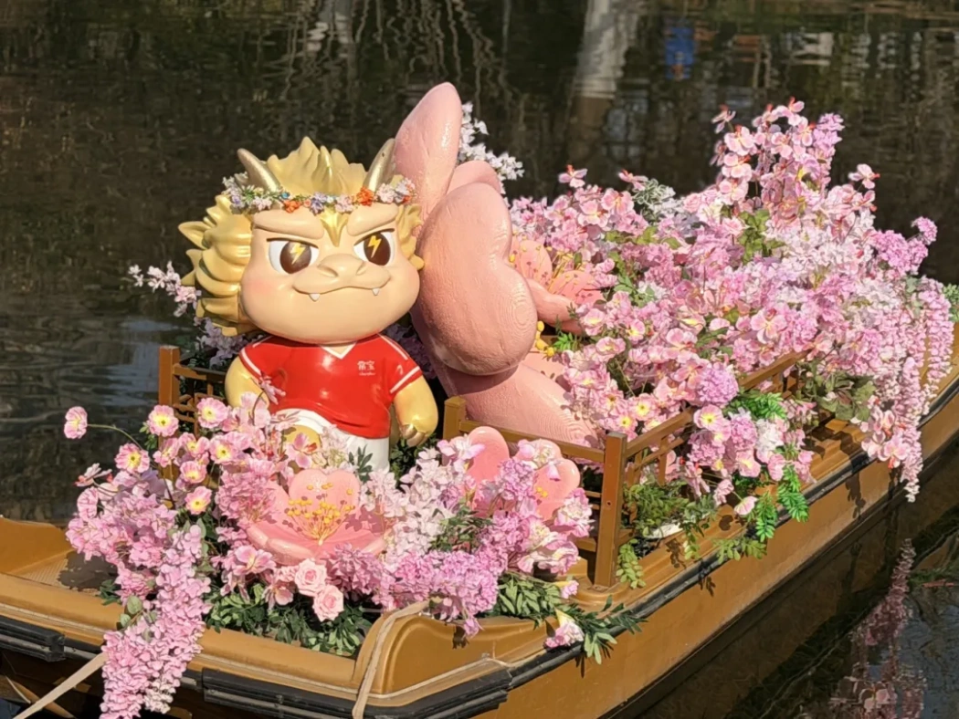 在江南水鄉(xiāng),早春的序曲總是由梅花奏響。江蘇常州便是這抹春色里最具代表性的剪影。龍城正月,古運(yùn)河畔紅燈籠高掛,紅梅公園內(nèi),唐代紅梅閣翹角飛檐,閣前紅梅燦若云霞,恰如趙翼詩(shī)中所繪的盛景。這里的賞梅,早已不是單純的游園,而是一場(chǎng)雅俗共賞的年俗盛會(huì)。文旅IP“常寶"穿梭送福,打卡點(diǎn)紅燈籠高懸,大年初一的市集上,手作、梅花好物琳瑯滿目,糖畫(huà)、梅花酥香氣四溢,文筆塔的花瀑氛圍拉滿,市民在梅香與煙火氣中收獲新春幸福。