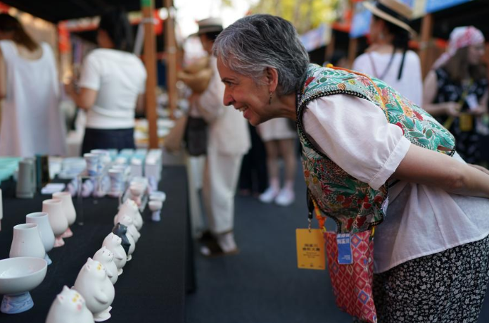 2025年10月17日,在江西景德鎮(zhèn)舉行的2025中國景德鎮(zhèn)國際陶瓷博覽會同期舉辦的陶瓷嘉年華上,一位外國藝術(shù)家正在欣賞陶瓷作品。圖源:新華社