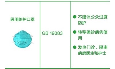 醫(yī)用防護(hù)口罩:推薦發(fā)熱門(mén)診、隔離病房醫(yī)護(hù)人員,以及確診新型冠狀病毒感染患者轉(zhuǎn)移使用。資源缺乏時(shí),不建議公眾過(guò)度防護(hù),可留給一線(xiàn)醫(yī)護(hù)人員使用。(橫列為口罩的圖片+名稱(chēng)、產(chǎn)品標(biāo)準(zhǔn)、建議應(yīng)用場(chǎng)景。圖片來(lái)源:中國(guó)疾控中心)