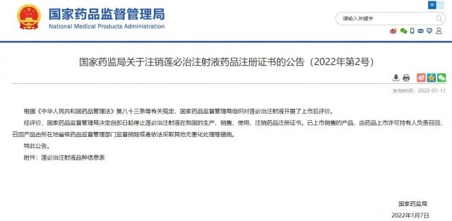 據(jù)國(guó)家藥監(jiān)局網(wǎng)站消息,國(guó)家藥品監(jiān)督管理局11日發(fā)布公告,決定自即日起停止蓮必治注射液在我國(guó)的生產(chǎn)、銷售、使用,注銷藥品注冊(cè)證書。已上市銷售的產(chǎn)品,由藥品上市許可持有人負(fù)責(zé)召回,召回產(chǎn)品由所在地省級(jí)藥品監(jiān)督管理部門監(jiān)督銷毀或者依法采取其他無害化處理等措施。