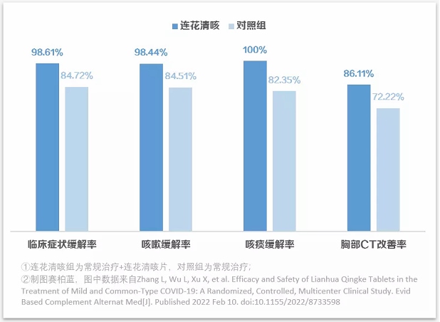 具體來看,與常規(guī)治療組相比,使用了連花清咳片的患者在咳嗽、咳痰緩解率以及胸部CT改善率方面均有更好的表現(xiàn),同時,緩解時間也有所提前,且無不良反應事件。