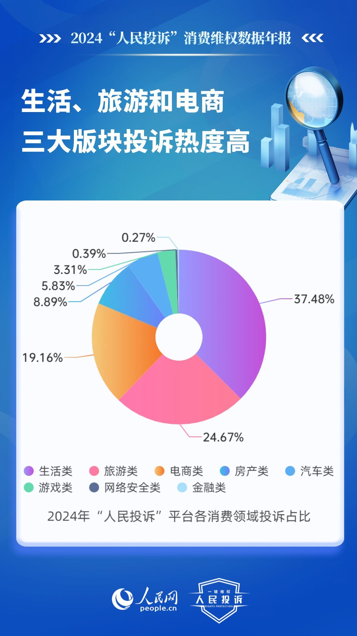 據(jù)統(tǒng)計(jì),在網(wǎng)友投訴的消費(fèi)重點(diǎn)領(lǐng)域,生活類占比37.48%、旅游類24.67%、電商類19.16%、房產(chǎn)類8.89%、汽車類5.83%、游戲類3.31%、網(wǎng)絡(luò)安全類0.39%、金融類0.27%。其中,生活、旅游和電商三大版塊投訴熱度較高。