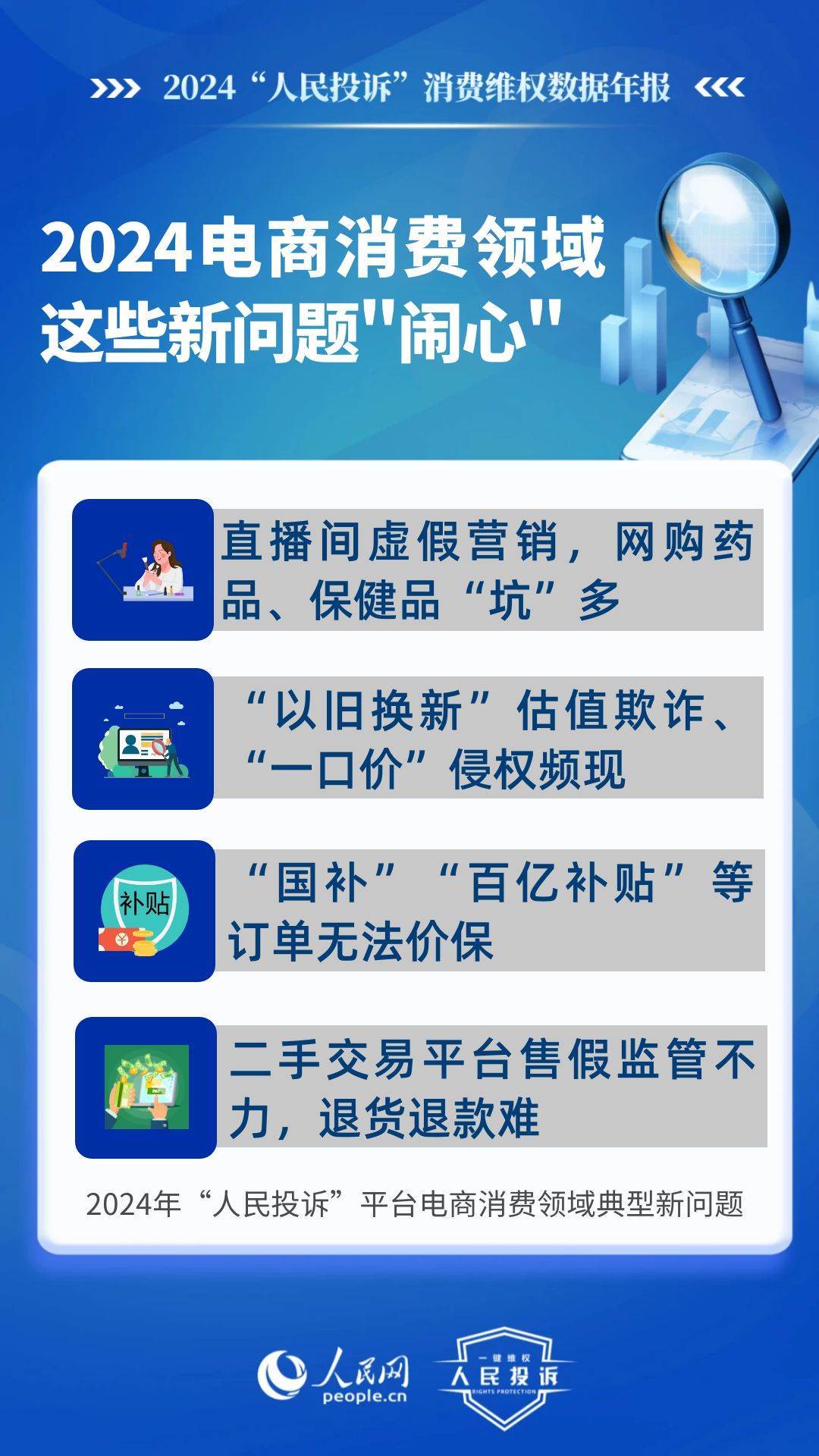 新問題體現(xiàn)在:直播間虛假營銷,購買玉石/網(wǎng)課/旅游產(chǎn)品等消費(fèi)“踩雷”多;“以舊換新”估值欺詐、“一口價(jià)”侵權(quán)頻現(xiàn);“國補(bǔ)”“百億補(bǔ)貼”訂單不給價(jià)保;二手交易平臺(tái)對(duì)商家售假監(jiān)管不力、“陰陽”檢測、退貨退款難;網(wǎng)購藥品/保健品/醫(yī)療器械“坑”多等。