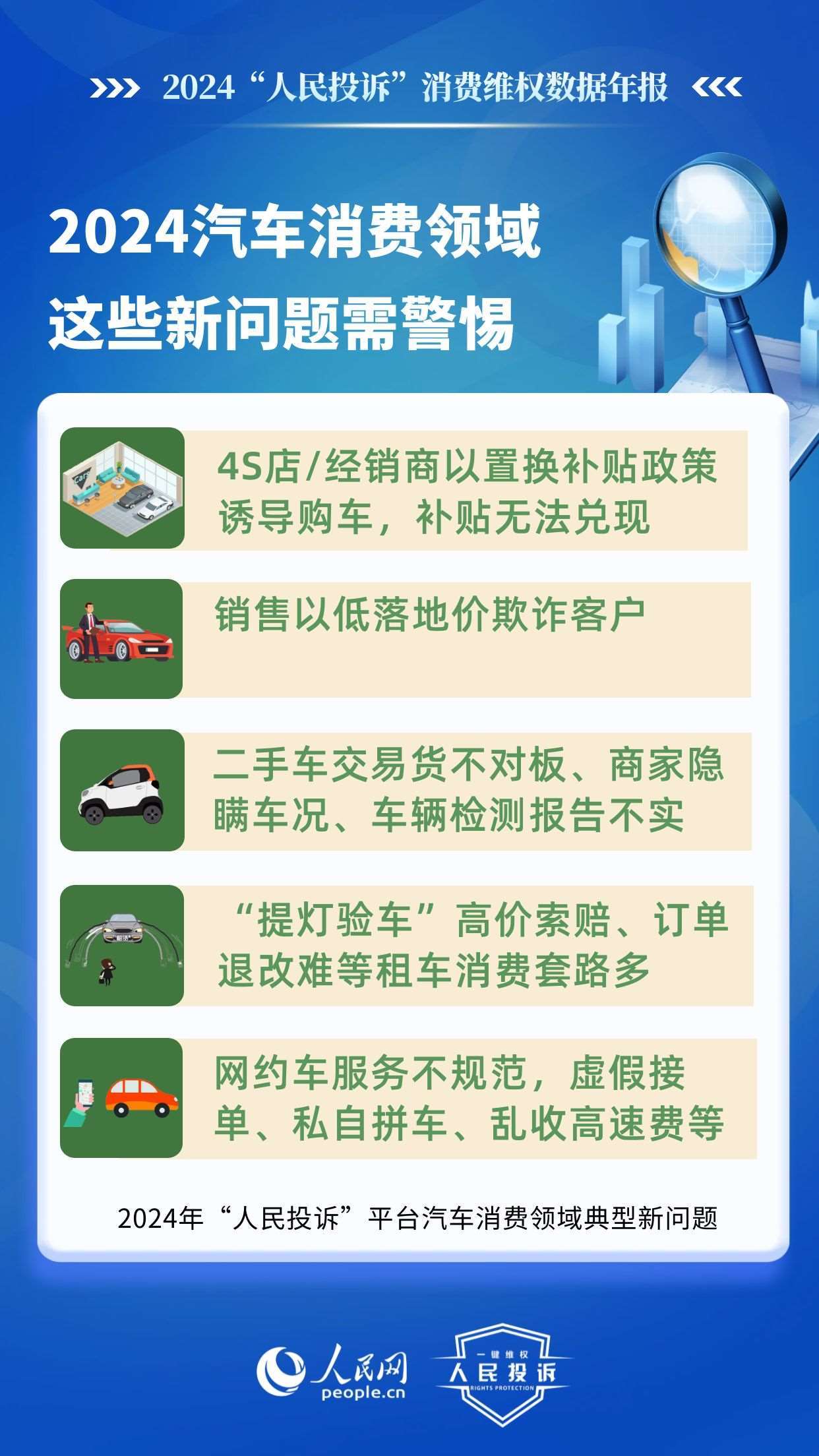 新問題體現(xiàn)在:4S店/經(jīng)銷商以置換補(bǔ)貼政策誘導(dǎo)購車,結(jié)果補(bǔ)貼無法兌現(xiàn);銷售以低落地價(jià)欺詐客戶;二手車交易貨不對(duì)板、商家隱瞞車況、平臺(tái)車輛檢測報(bào)告不實(shí);惡意租“故障車”、“提燈驗(yàn)車”高價(jià)索賠、低價(jià)誘租、訂單退改難等租車消費(fèi)套路多;網(wǎng)約車服務(wù)不規(guī)范,人車不符、虛假接單、私自拼車、亂收高速費(fèi)等。