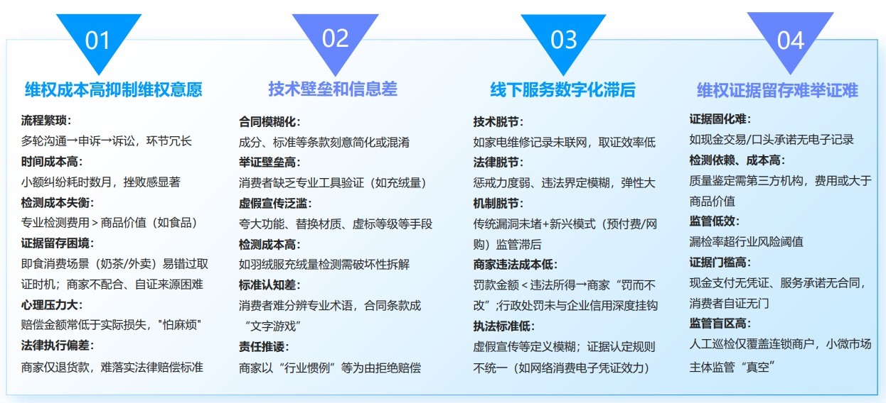 “人民投訴”分析認(rèn)為,在傳統(tǒng)消費(fèi)領(lǐng)域,消費(fèi)者往往由于維權(quán)成本高、存在技術(shù)壁壘和信息差、線下服務(wù)標(biāo)準(zhǔn)不一、舉證難等原因使得維權(quán)難、維權(quán)慢、維權(quán)貴等現(xiàn)象始終未能有效減少。