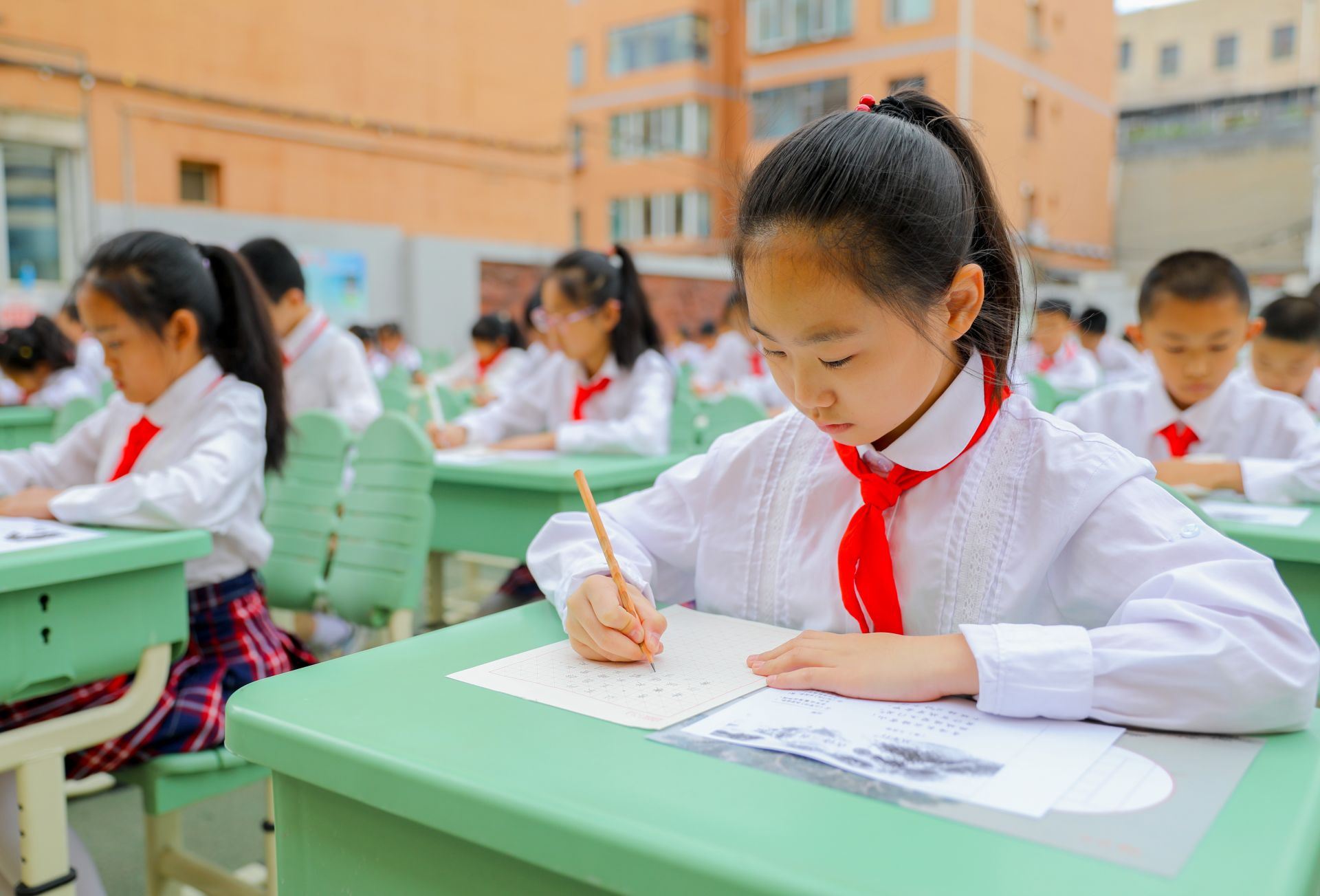 6月13日,呼和浩特市玉泉區(qū)恒昌店巷小學(xué)的學(xué)生們正在參加書法比賽。當(dāng)日,該?!靶@書法文化節(jié)”漢字書寫大賽開賽,200多名學(xué)生在硬筆和軟筆項目上展開比拼。活動旨在提高孩子們漢字書寫水平,弘揚中華民族優(yōu)秀傳統(tǒng)文化。
