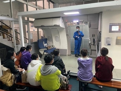 航空企業(yè)在實(shí)訓(xùn)基地組織實(shí)施空乘專業(yè)教師培訓(xùn)項(xiàng)目,此為參訓(xùn)教師學(xué)習(xí)正常與緊急情況開(kāi)關(guān)艙門的要領(lǐng)、機(jī)上應(yīng)急設(shè)備