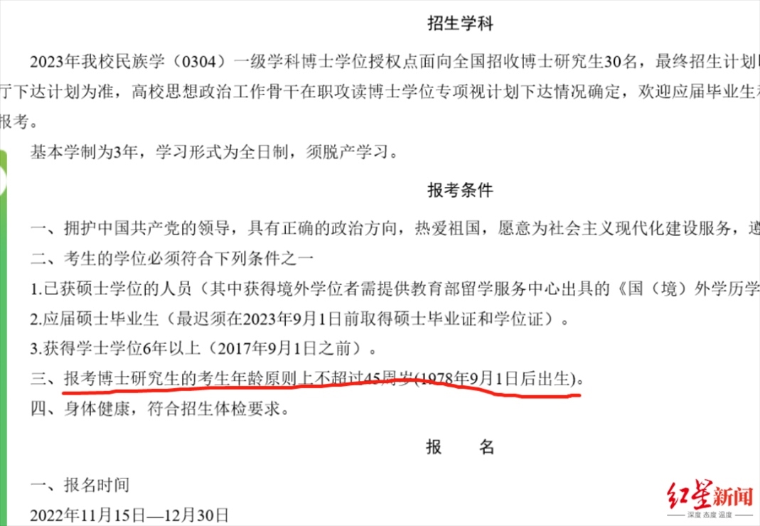 而根據(jù)《青海民族大學(xué)2023年民族學(xué)博士研究生招生簡章》,報考博士研究生的考生年齡原則上不超過45周歲(1978年9月1日后出生)。資料顯示,阿進(jìn)錄為1973年出生。對于網(wǎng)友提到的“年齡不符合報考條件”,上述工作人員表示:“他資格審查是通過的?!?/strong>