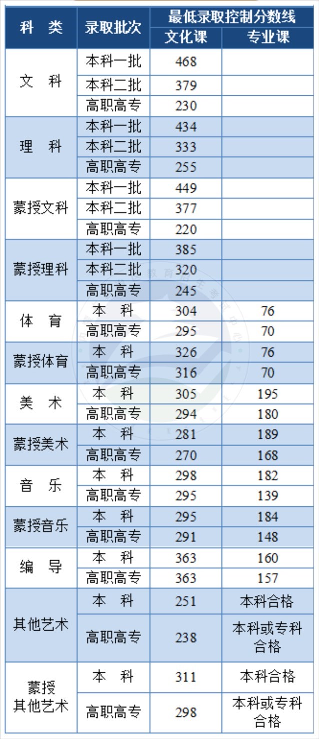 內(nèi)蒙古普通高考最低錄取控制分數(shù)線