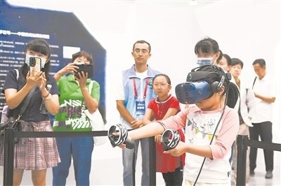 9月17日,在全國科普日北京主場活動展區(qū),小朋友使用虛擬現實設備感受天和核心艙內的生活。新華社記者 鞠煥宗攝