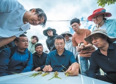 科技創(chuàng)新中國工程院院士張福鎖(中)和科技小院學生、農(nóng)民一起探討中稻種植技術。趙 渝攝(人民視覺)
