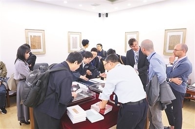 參加“古文字與中華文明”國(guó)際學(xué)術(shù)論壇的專家學(xué)者在參觀清華簡(jiǎn)。