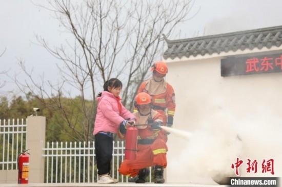 圖為消防員為師生講解手提式干粉滅火器的使用原理,并設(shè)置“火災(zāi)”場景,組織師生實(shí)操體驗(yàn)。 王治康 攝