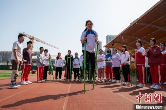 3月19日,香港學(xué)生體驗(yàn)少數(shù)民族傳統(tǒng)體育項(xiàng)目《高蹺》。唐哲 攝
