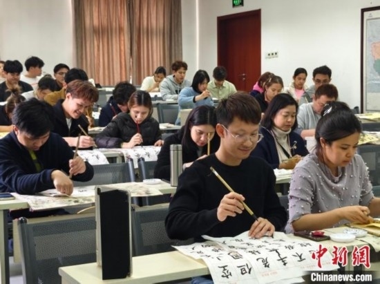 4月3日,在北京華文學(xué)院學(xué)習(xí)的泰國(guó)學(xué)員在上書法課。(中新網(wǎng)記者韓輝 攝)