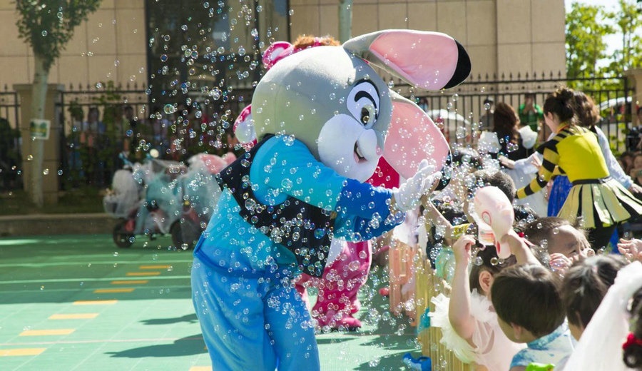 當(dāng)日,打扮成迪士尼童話里人物的老師們與盛裝打扮的小朋友們,共同手持泡泡機(jī),在晶瑩剔透的泡泡里一起沉浸在童話世界里。