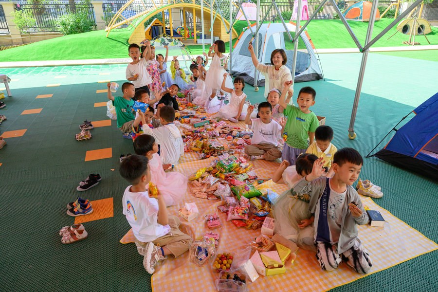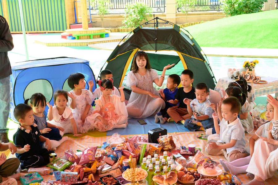 當日,在幼兒園的操場上,五顏六色的野餐墊鋪,可愛俏皮的帳篷,精致的裝飾,數(shù)不勝數(shù)的水果點心,小朋友們在陰涼處盡情享受著美味,與老師們一起享受著夏日里野餐派對的美好。