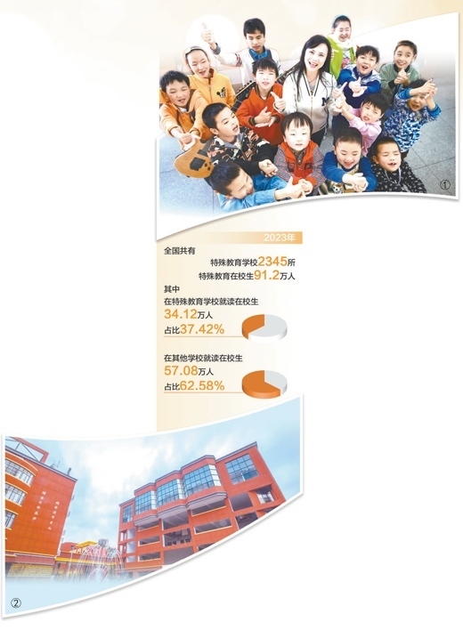 黨的十八大以來,從支持特殊教育,到辦好特殊教育,再到強(qiáng)化特殊教育普惠發(fā)展,我國特殊教育發(fā)展內(nèi)涵逐步深化,特殊教育普及水平和保障條件得到提升。2023年,全國共有特殊教育學(xué)校2345所,特殊教育在校生91.2萬人,其中,在特殊教育學(xué)校就讀在校生34.12萬人,占比37.42%;在其他學(xué)校就讀在校生57.08萬人,占比62.58%。