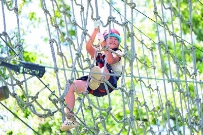 孩子在江蘇南京一家探險(xiǎn)樂(lè)園體驗(yàn)“樹(shù)上探險(xiǎn)”活動(dòng)。新華社發(fā)