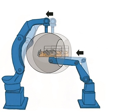 為了破解動物在完全黑暗的管道、隧道中也能迅速轉(zhuǎn)彎、穿越障礙,并準確地抵達目的地的秘密,科學(xué)家們設(shè)計了一種獨特的運動模擬器。該模擬器采用同步的工業(yè)機械臂來模擬不同的運動狀態(tài)。實驗中,老鼠被放在模擬器中接受各種運動刺激,儀器同時報告它們感知到的運動方向。結(jié)果顯示,老鼠對極其微小的氣流變化都異常敏感,它們確實能夠利用這種氣流信息,增強自身對運動的感知和判斷力。