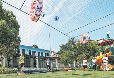 | 航模隊(duì)隊(duì)員在操場(chǎng)上進(jìn)行無人機(jī)足球?qū)官?。李桂東攝(人民視覺) |