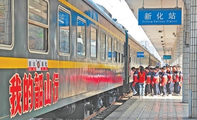 伴著汽笛長鳴,一列紅色研學專列駛進韶山站。這是中國鐵路廣州局集團有限公司推出的“我的韶山行”紅色研學專列。車廂內(nèi),“乘風破萬卷,追風正少年”標語引人注目。打造“書香列車”主題車廂,在餐車設立“書香驛站”,將吧臺改造成“陽光書社”,設計留言帖、主題打卡點,發(fā)放文創(chuàng)紀念票卡……列車寓學于途,開設韶山站現(xiàn)場教學點,打造火車上的流動課堂。