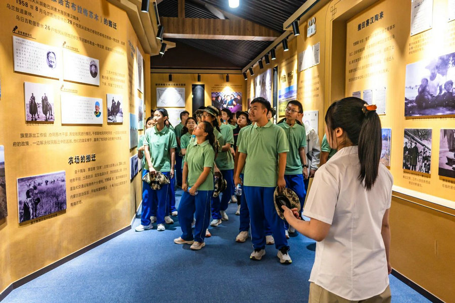 在寶日烏拉黨政機關(guān)舊址,同學(xué)們聆聽講解,了解“最好牧場為航天”的感人往事, 感受老一輩建設(shè)者們在風(fēng)沙中對祖國的赤誠。烏海市第十中學(xué)胡林濤說:“聽了‘最好牧場為航天’的故事,我真正懂得了什么是舍小家為國家。他們帶著牲畜離開世代生活的牧場,沒有一句抱怨,眼里只有對國家的支持,這種家國情懷太打動人了,以后我也要把這份擔(dān)當(dāng)記在心里,努力成為對國家有用的人。”