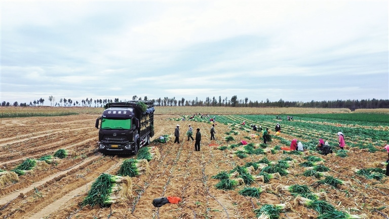 深秋時(shí)節(jié),通遼市奈曼旗沙日浩來(lái)鎮(zhèn)水泉嘎查大蔥種植基地一派繁忙的豐收景象,人們井然有序地拔蔥、捆綁、裝車,臉上洋溢著豐收的喜悅。