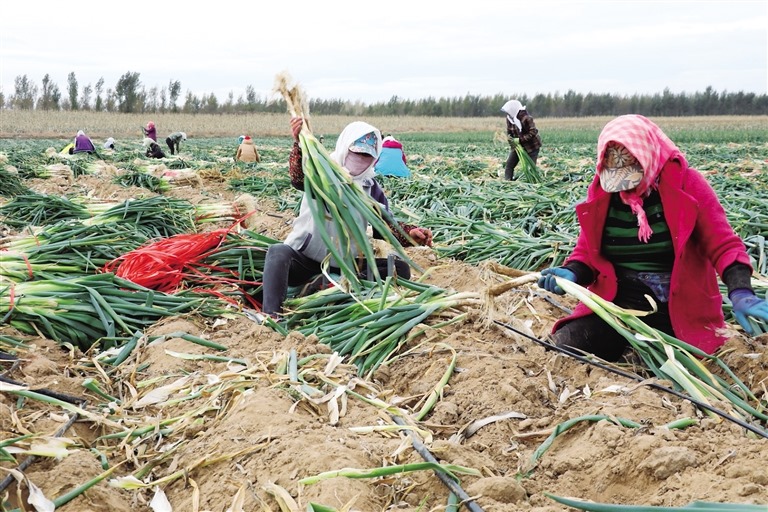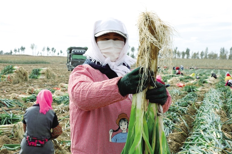 正在忙著收蔥打捆的村民于新穎說:“看這蔥長(zhǎng)得多好!”