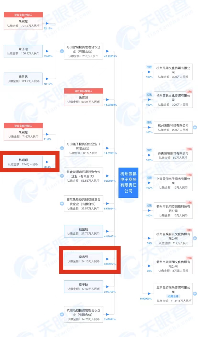 天眼查APP顯示,林珊珊在11家公司任職,其中,與雪梨創(chuàng)辦舟山蘊予投資合伙企業(yè)(有限合伙),林珊珊持股28.4%,雪梨持股71.6%,而舟山蘊予投資合伙企業(yè)(有限合伙)又是宸帆電商的股東,持股比例約14%。