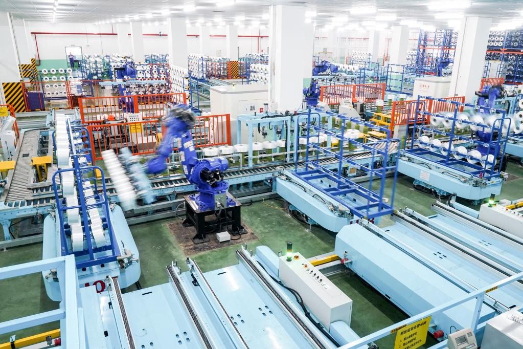 位于江蘇省蘇州市吳江區(qū)盛澤鎮(zhèn)的一家智能車(chē)間,機(jī)器人在車(chē)間內(nèi)自動(dòng)作業(yè)。新華社記者 李博 攝