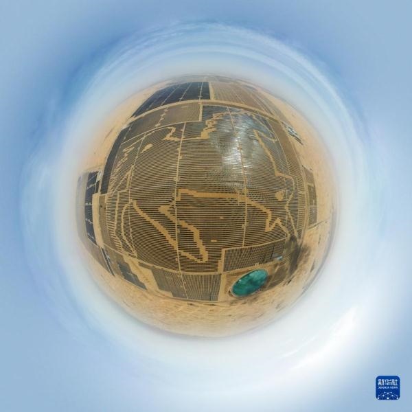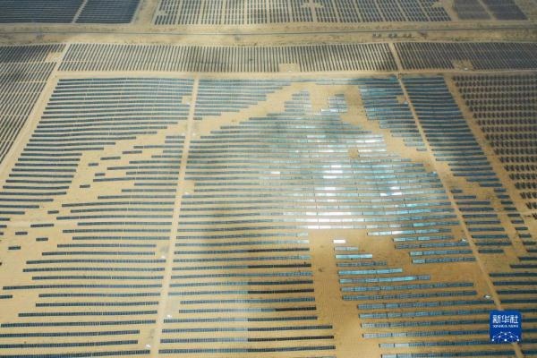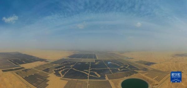 一匹占地130多萬平方米的沙漠“駿馬”橫臥在內蒙古自治區(qū)庫布其沙漠之中,這是位于達拉特光伏發(fā)電應用領跑基地中、由近20萬塊光伏板組成的“駿馬電站”。該電站采用“林光互補”模式,板上發(fā)電、板下種植,在開發(fā)利用庫布其沙漠豐富太陽能資源的同時,推動沙漠生態(tài)治理。