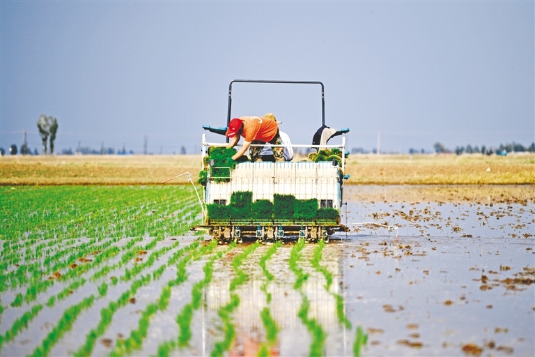 5月22日,鄂爾多斯市達拉特旗昭君鎮(zhèn)沙圪堵村水稻種植戶正在插秧。據(jù)了解,達拉特旗充分利用鹽堿地,種植耐鹽堿水稻,帶動村民增收致富,今年預計種植3.8萬畝。(本報記者 孟和朝魯 攝)