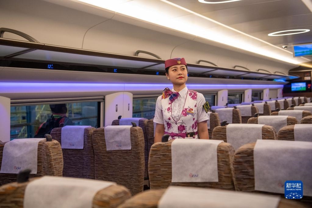 6月19日,鐵路工作人員在首發(fā)列車CR400AF復興號動車組上。新華社記者 唐奕 攝