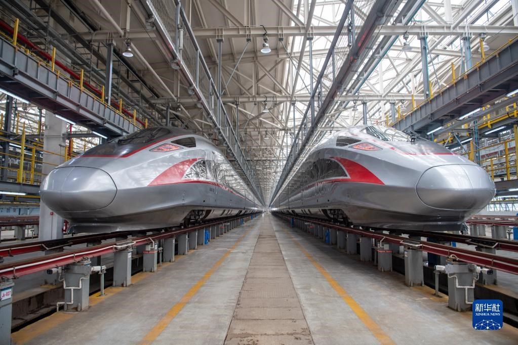6月19日,鄭渝高鐵全線開通運營重慶首發(fā)列車CR400AF復興號動車組(左)在重慶車輛段西動車所亮相。新華社記者 唐奕 攝