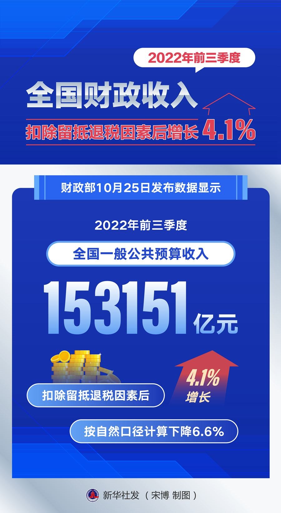 財(cái)政部25日發(fā)布數(shù)據(jù)顯示,今年前三季度,全國(guó)一般公共預(yù)算收入153151億元,扣除留抵退稅因素后增長(zhǎng)4.1%,按自然口徑計(jì)算下降6.6%。