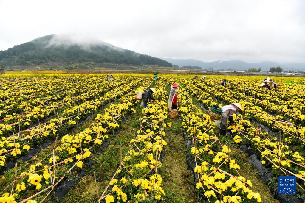金秋時節(jié),貴州省黔南布依族苗族自治州貴定縣云霧鎮(zhèn)種植的1000余畝菊花陸續(xù)進入采摘期,當?shù)卮迕衩χ烧⒎謷?、烘干菊花,供應市場?/p>