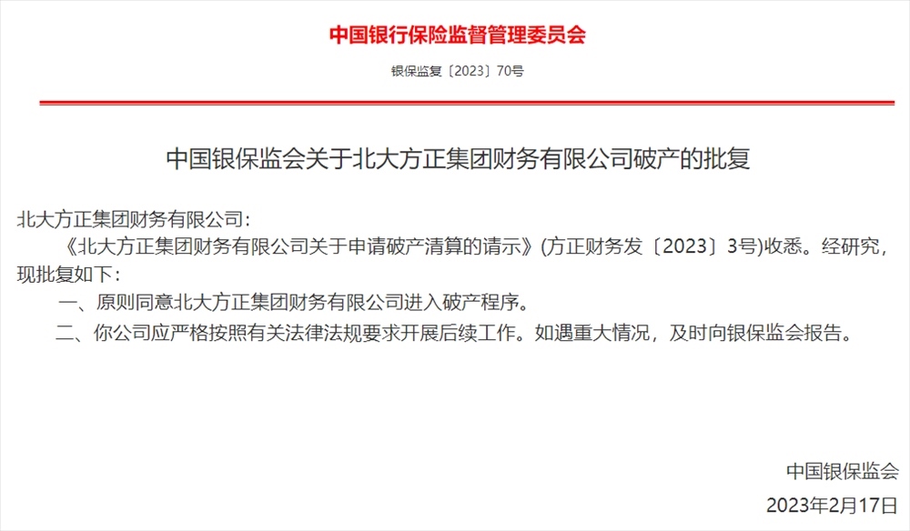 人民網(wǎng)北京2月21日電 (記者羅知之)據(jù)銀保監(jiān)會(huì)官網(wǎng)消息,銀保監(jiān)會(huì)今日發(fā)布了關(guān)于北大方正集團(tuán)財(cái)務(wù)有限公司破產(chǎn)的批復(fù)。批復(fù)指出,原則同意北大方正集團(tuán)財(cái)務(wù)有限公司進(jìn)入破產(chǎn)程序,該公司應(yīng)嚴(yán)格按照有關(guān)法律法規(guī)要求開(kāi)展后續(xù)工作。