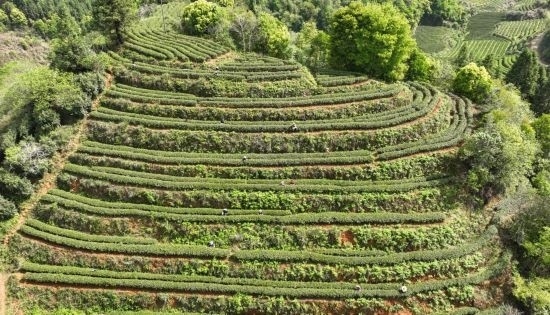 在福建省武夷山市,采茶女工在茶山采茶(無人機(jī)照片,2023年4月7日攝)。新華社發(fā)(邱汝泉 攝)