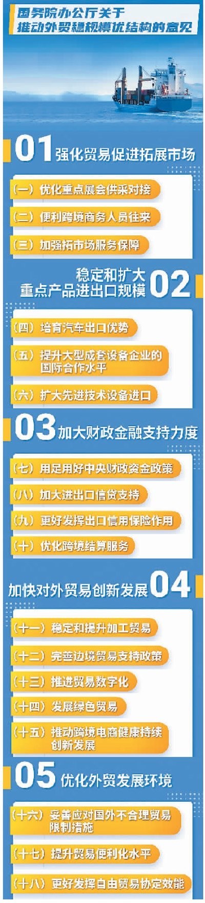 為推動外貿(mào)穩(wěn)規(guī)模優(yōu)結構,在前期已出臺多輪政策舉措的基礎上,國務院辦公廳4月25日對外發(fā)布《關于推動外貿(mào)穩(wěn)規(guī)模優(yōu)結構的意見》(以下簡稱《意見》),推出新一輪措施。專家認為,此次提出的18條具體措施既涉及重點產(chǎn)品,也關乎市場拓展和貿(mào)易創(chuàng)新,具有很強的針對性和操作性,有助于穩(wěn)住外貿(mào)規(guī)模,并在此基礎上進一步優(yōu)化外貿(mào)結構,推動實現(xiàn)全年進出口促穩(wěn)提質目標任務。