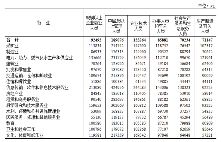 2022年全國規(guī)模以上企業(yè)就業(yè)人員年平均工資為92492元,比上年名義增長5.0%。其中,中層及以上管理人員189076元,增長4.7%;專業(yè)技術(shù)人員133264元,增長6.6%;辦事人員和有關人員85881元,增長4.1%;社會生產(chǎn)服務和生活服務人員70234元,增長3.3%;生產(chǎn)制造及有關人員71147元,增長3.9%。