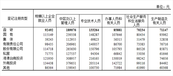 2022年分登記注冊類型分崗位就業(yè)人員年平均工資。圖片來源:國家統(tǒng)計局官網(wǎng)