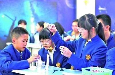 在內(nèi)蒙古阿拉善盟額濟納旗地面課堂,學(xué)生在做趣味實驗。新華社發(fā)
