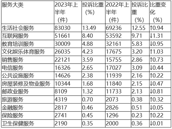 根據(jù)2023年上半年服務(wù)大類投訴數(shù)據(jù)(如圖3、表3所示),生活社會(huì)服務(wù)類、互聯(lián)網(wǎng)服務(wù)類、教育培訓(xùn)服務(wù)類、文化娛樂(lè)體育服務(wù)類與銷售服務(wù)類居于服務(wù)類投訴量前五位。與2022年上半年相比,文化娛樂(lè)體育服務(wù)類、生活社會(huì)服務(wù)類投訴比重有所上升,互聯(lián)網(wǎng)服務(wù)類、教育培訓(xùn)服務(wù)類投訴比重略有下降。