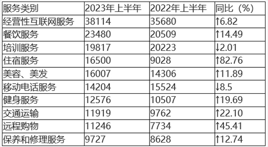 在具體服務(wù)投訴中,投訴量居前五位的分別為(如圖5、表5所示)經(jīng)營(yíng)性互聯(lián)網(wǎng)服務(wù)、餐飲服務(wù)、培訓(xùn)服務(wù)、住宿服務(wù)、美容美發(fā)。與2022年上半年相比,住宿服務(wù)、遠(yuǎn)程購(gòu)物、保養(yǎng)和修理服務(wù)進(jìn)入服務(wù)類投訴前十。其中,住宿服務(wù)、遠(yuǎn)程購(gòu)物投訴量同比顯著增長(zhǎng),移動(dòng)電話服務(wù)投訴量同比有所下降。